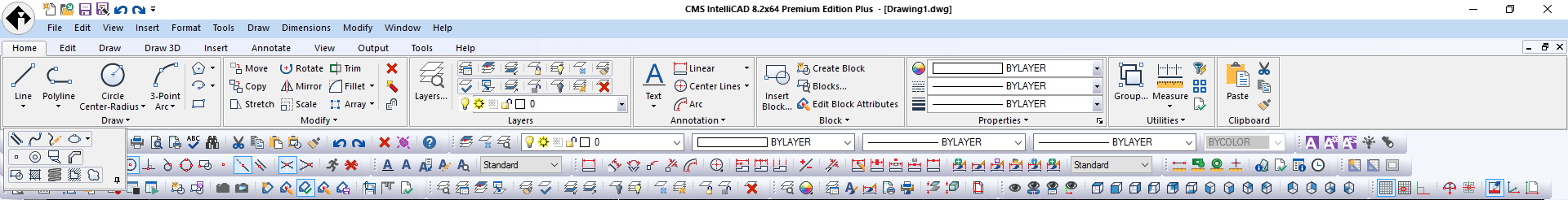 At this main tab, users have access to the main, and most used, entity creation and editing features. Draw lines, curves, circles, modify entities, insert text, annotate and insert dimensions, create, insert and edit cad blocks, control layer features and share or transfer entities through Windows clipboard
